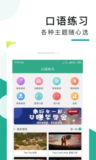 6.丰富的学习素材:课程覆盖日常会话、职场商务、旅游出行、校园生活等各类场景;