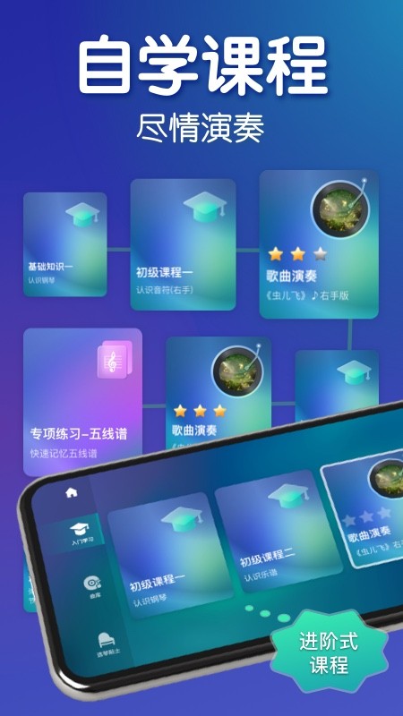 掉音跟弹功能让你轻松弹奏各种流行、古典的乐曲。丰富的曲库,满足不同喜好和水平的用户,让您在演奏中感受音乐的魅力。