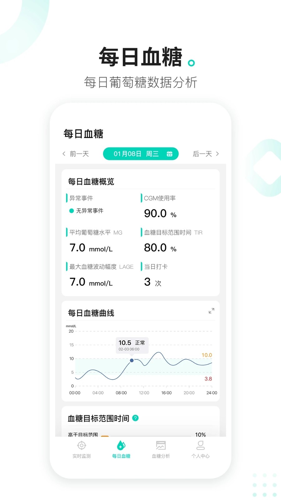 3、可以通过佩戴的cgM传感器了解你的实时血糖情况,跟踪血糖波动数据等。