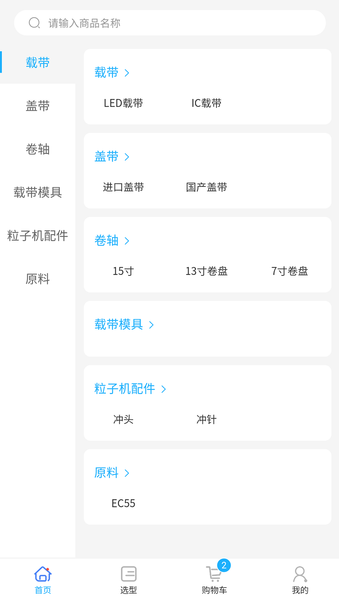 4、来到软件首页,可查看载带、盖带、卷轴、原料等内容。