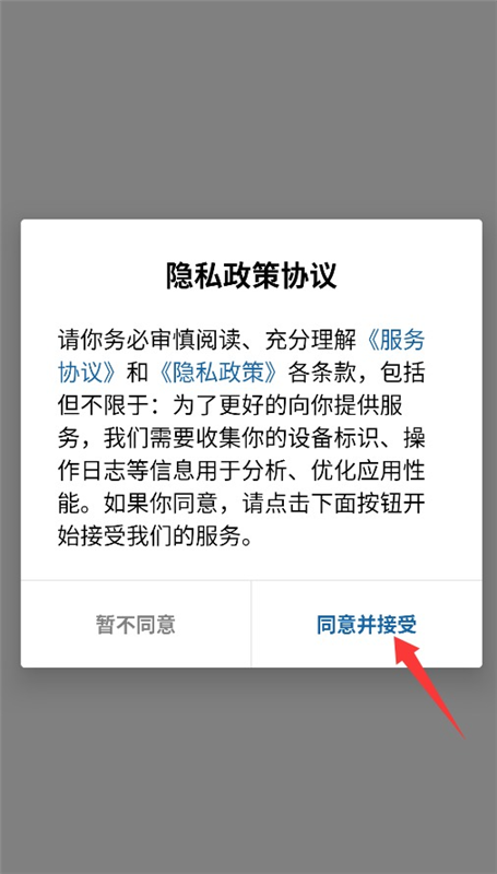 1、启动应用会显示隐私政策,需点击同意并接受后才可进入主界面。