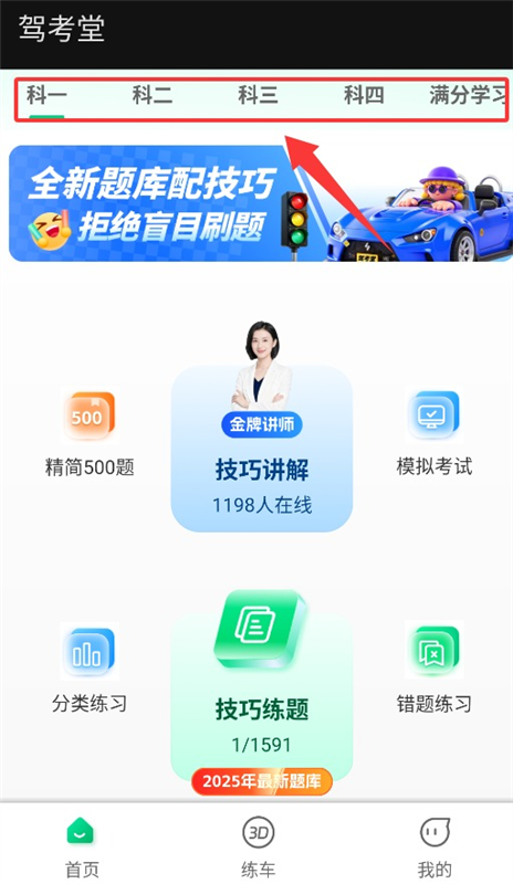 2、首页设有科一至科四及满分学习等不同模块,供用户选择学习。