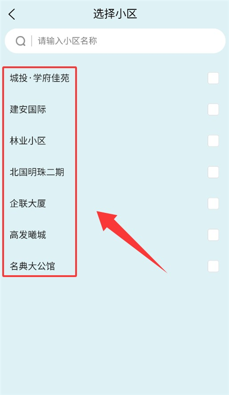 3、选择小区需输入名称或点击小区按钮,通过验证完成注册。