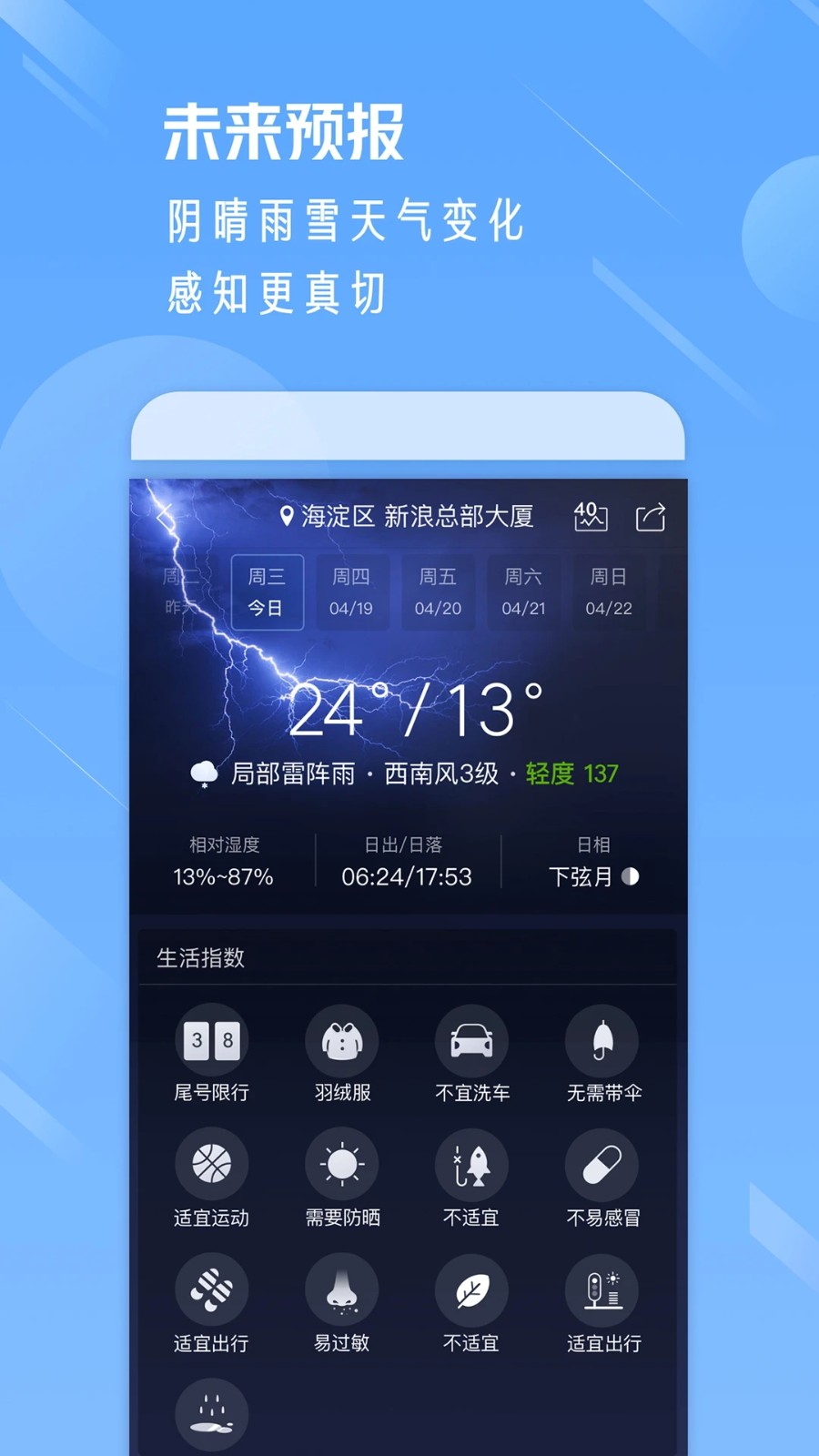生活指数:穿衣带伞出行建议、限行防晒温馨提示、为有车一族提供洗车参考,为抵抗力薄弱人群提供过敏感冒易发程度提醒。