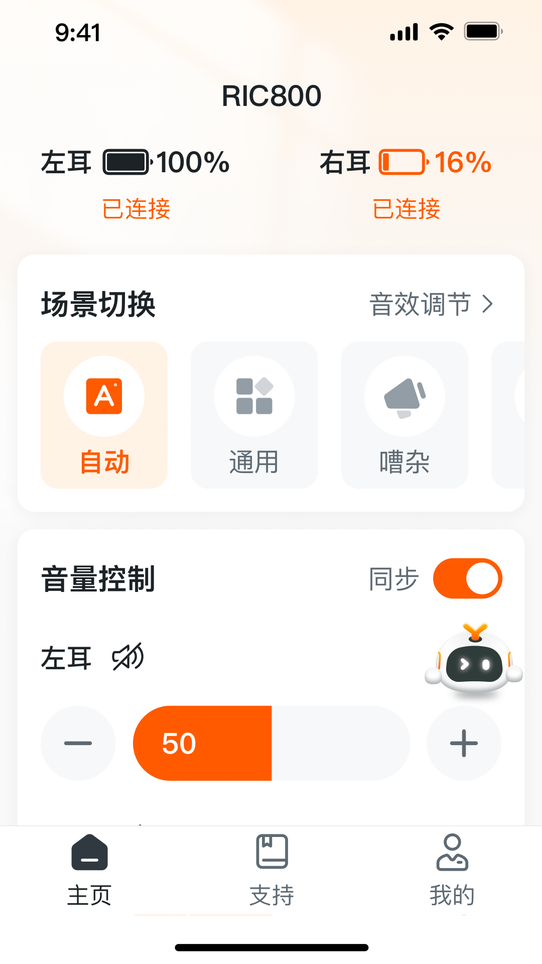音量调节:在首页滑动左右耳音量条,调整到舒适水平。