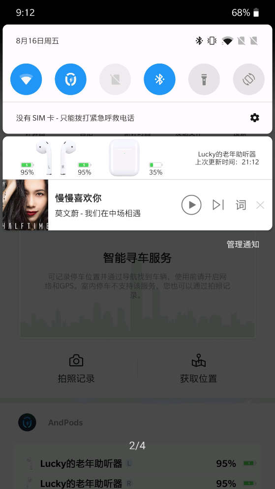 2、与此同时,AndPods 也支持 AirPods 自动人耳检测,当其中 AirPods 从耳朵上取下时会自动暂停播放音乐,放回耳朵时会继续播放音乐。