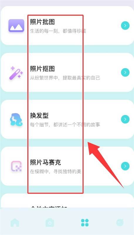 4、多功能页支持照片批图、构图指导、发型更换及马赛克处理。