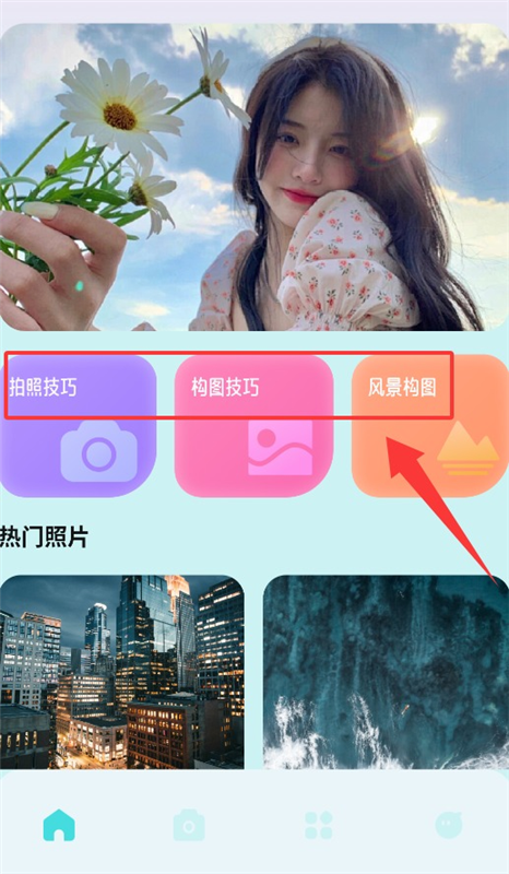 2、首页提供拍照技巧、构图方法与风景构图等摄影知识内容。
