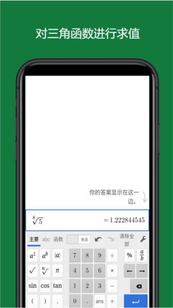 点击功能键盘上的相应按钮,可以输入三角函数(如sin、cos、tan等)及其反函数。