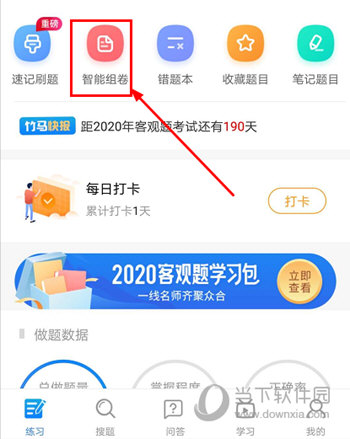 1、打开竹马法考APP,进入到“练习”功能界面,选择“智能组卷”功能按钮,点击进入即可。