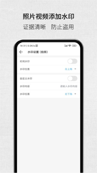4、自定义水印功能:允许用户在拍摄的照片和视频中添加个性化水印,增强证据的真实性和可信度。