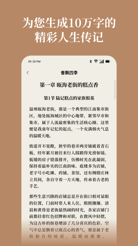 4、 将传记划分为童年、求学、事业、家庭等不同章节,每章通过一系列相关问题引导用户讲述。