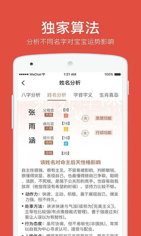 专业起名:舍弃三才五格,提出河洛数理法,提前预知姓名对宝宝后天的影响。app中包含生肖喜忌、字义音义、性格特点以及工作方向推荐,是宝宝起名字取名字的起名宝典,好听助运;好的人生,从好名开始!