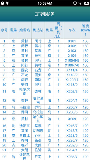 班列服务功能,显示出发局、始发站、到达站、到局、日期、车次、速度等班列信息;