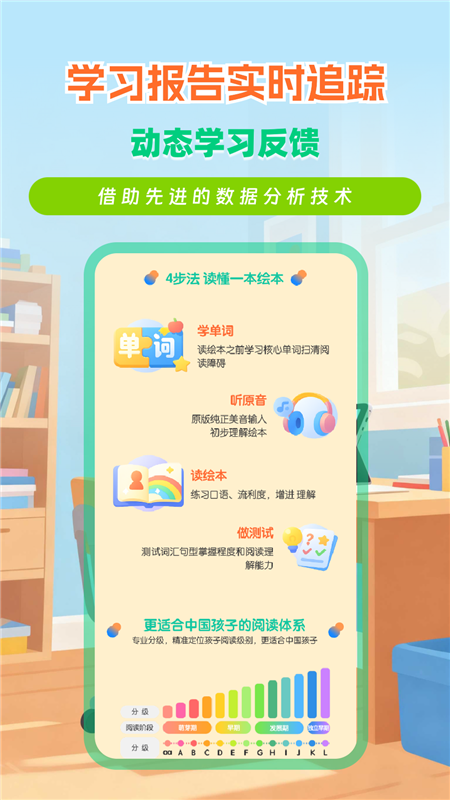 RAZ分级学习APP是一款基于RAZ体系、专为中国儿童设计的英语分级阅读APP。结合本土语言学习规律,将字母认读、自然拼读、句型理解与篇章阅读串联起来,为孩子规划从入门到流利阅读的清晰成长路径。