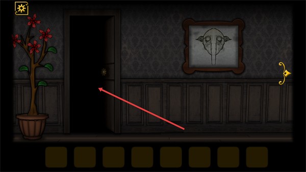 2.进入游戏场景后,点击打开的房门可进入下一个房间区域,该场景包含装饰画、植物等元素,是解谜流程的推进步骤