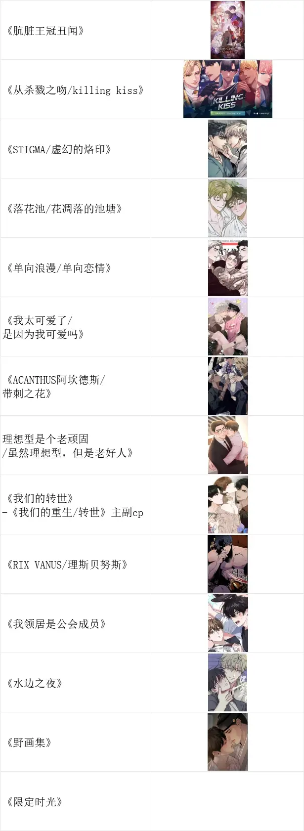 目前联动有《肮脏王冠丑闻》《从杀戮之吻/killing kiss》《STIGMA/虚幻的烙印》《落花池/花凋落的池塘》《单向浪漫/单向恋情》《因为我太可爱了/是因为我可爱吗》《ACANTHUS阿坎德斯/带刺之花》《理想型是个老顽固/虽然理想型,但是老好人》《我们的转世》-《我们的重生/转世》《RIX VANUS/理斯贝努斯》《我领居是公会成员》《水边之夜》《野画集》《限定时光》