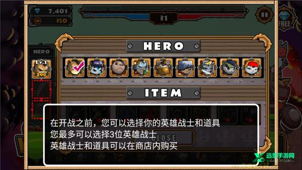 1、在开战之前,你可以选择你的英雄战士和道具,最多可以选择3位英雄战士,英雄和道具可在商店内购买
