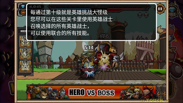 3、开动想象力来巧妙布置兵种与英雄,每个职业都能自由升级,无需CD,超给力BOSS等你挑战。