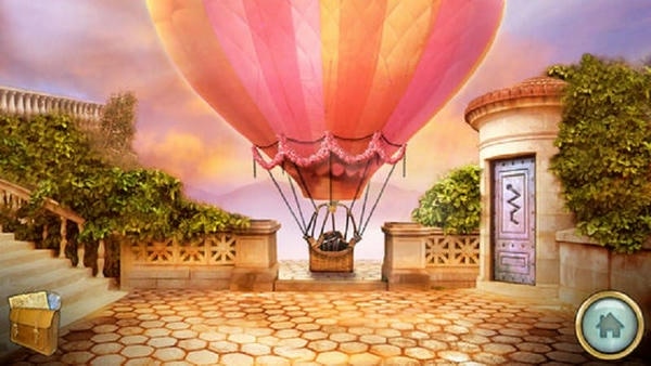 4、进门后,拿到一勺鸟食,然后退出房间来到有花儿的路口左转,捡起太阳雕像,并记录牵牛花的图案,然后上楼梯看到不能启动的热气球,在上楼梯,拿到斧头,喂食小鸟,记录鸟儿的图案