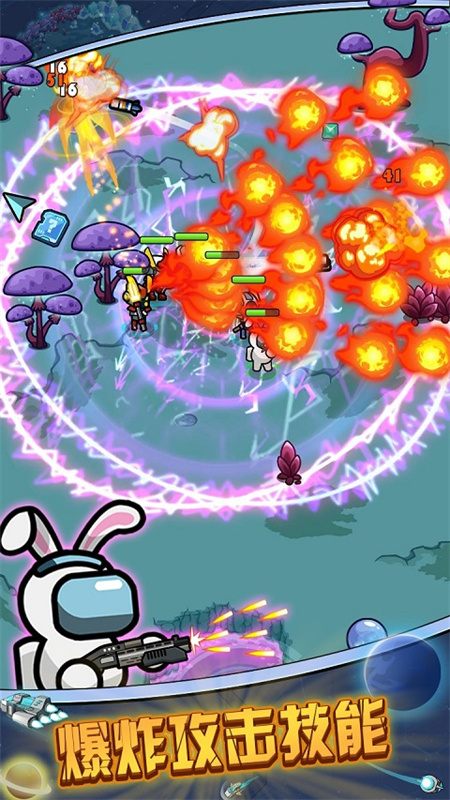 割草爽感拉满:面对成潮水般的像素风外星怪物,满屏弹幕与爆炸特效带来极致解压体验。角色攻速、射程与伤害随等级指数级增长,后期一枪清屏的快感让人欲罢不能,三分钟一局快速释放压力。